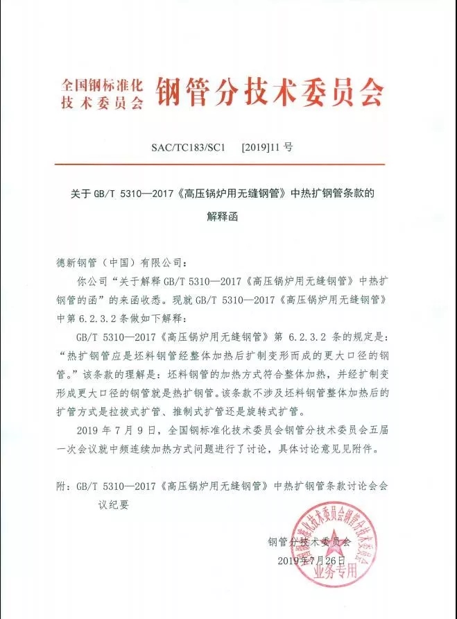 為此,德新鋼管向全國鋼標(biāo)準(zhǔn)化技術(shù)委員會發(fā)函尋復(fù):“與會代表在討論中對中頻熱擴(kuò)無縫鋼管提出了新的提議:中頻熱擴(kuò)鋼管是整根成品鋼管在控溫、控速、控變形率的狀態(tài)下,從一端到另一端經(jīng)連續(xù)均勻加熱后擴(kuò)制變形而成的更大口徑的鋼管,與GB/T5310-2017標(biāo)準(zhǔn)的6.2.3.2條款所述的熱擴(kuò)原理相同,目的一樣,可視為等效。我們認(rèn)為該提議符合客觀實(shí)際,基于這種認(rèn)識賦予6.2.3.2條款新的內(nèi)涵,可以有效地避免現(xiàn)有GB/T5310標(biāo)準(zhǔn)與國家法律法規(guī)的矛盾、GB/T5310標(biāo)準(zhǔn)與團(tuán)體標(biāo)準(zhǔn)之間的矛盾、GB/T5310標(biāo)準(zhǔn)整體加熱工藝的生產(chǎn)現(xiàn)實(shí)和市場需求的矛盾,敬請函復(fù)。”