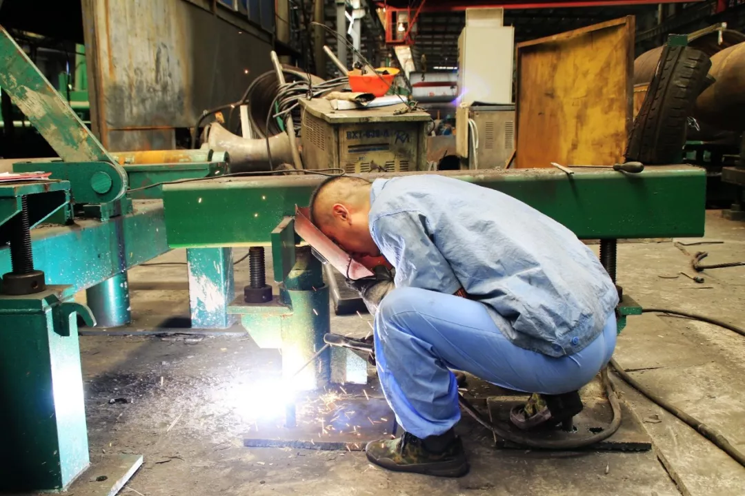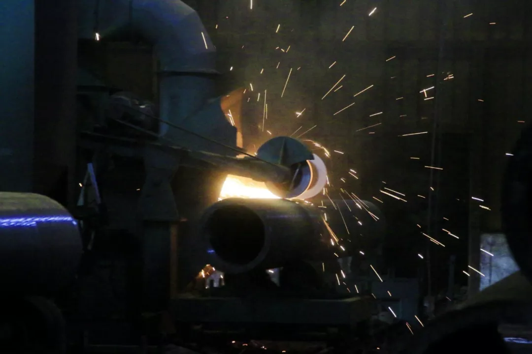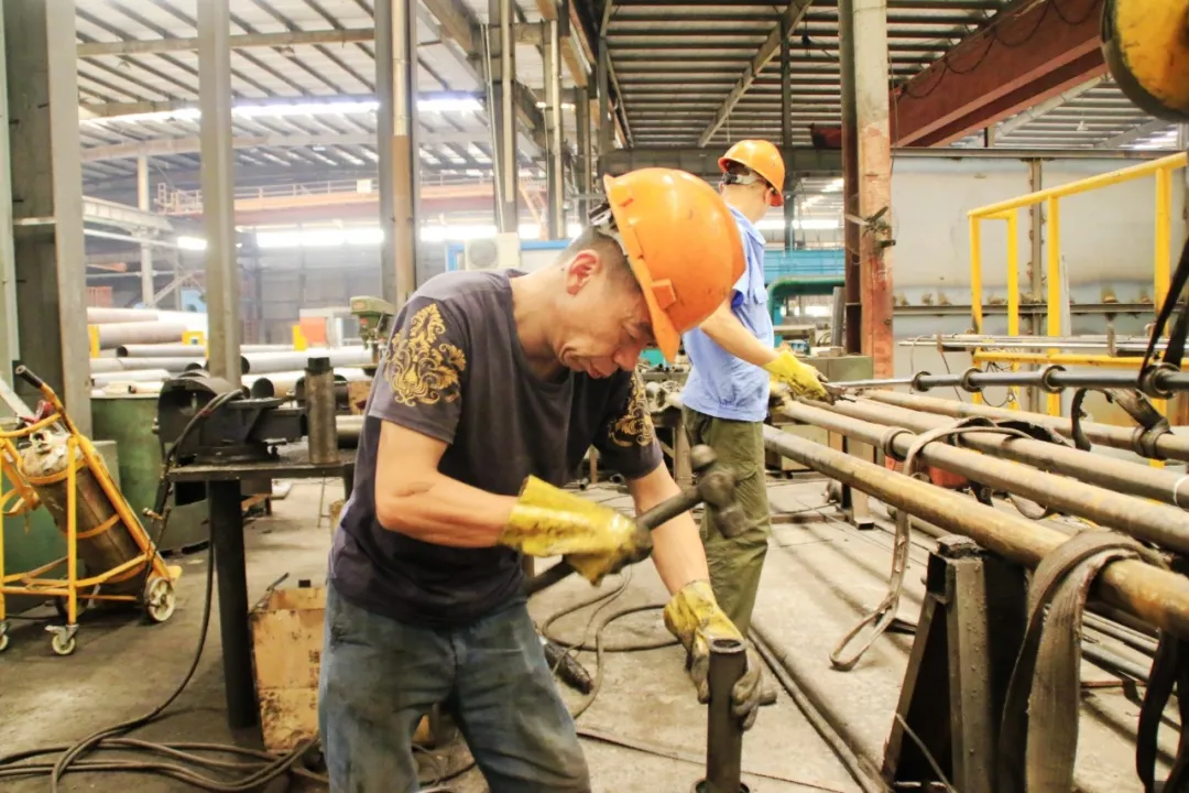 熱擴的線圈加熱區(qū)域,小編領教過,在十多度的日子一靠近都是熱浪撲面,更別說這樣的酷暑,我都不敢靠近。這時,一枚“導彈”緩緩移來,工人剛剛換下透著熱度的熱擴芯棒,準備定置到位。兩名工人流著汗帶著焊帽,利用間隙電焊作業(yè),緊固松動的螺絲。
